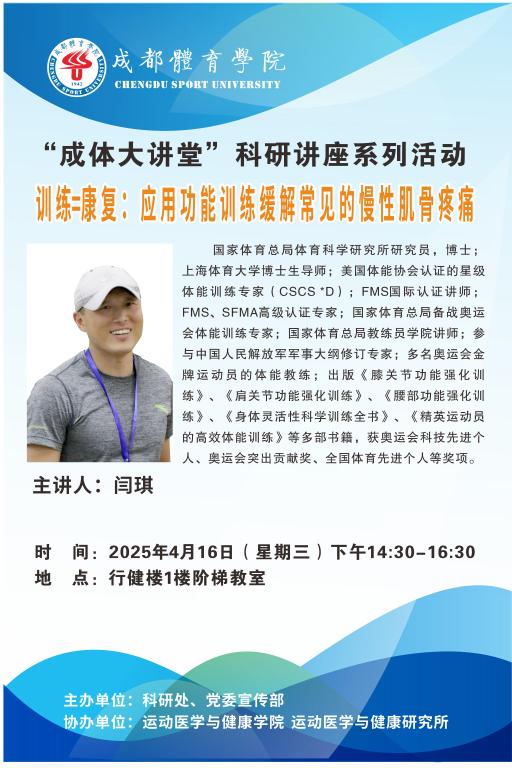 学校将于2025年4月16日(周三)下午14:30-16:30在行健楼1楼阶梯教室举行“成体大讲堂”科研讲座系列活动之师说。本次讲座特邀国家体育总局体育科学研究所闫琪老师主讲。题目为:《训练=康复:应用功能训练缓解常见的慢性肌骨疼痛》。欢迎全校师生积极参加。